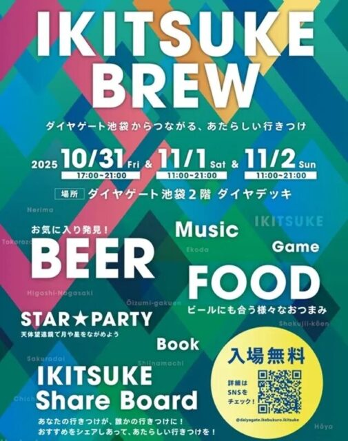 豊島区・池袋の新名所「ダイヤゲート池袋」2階の線路上空に広がる公開空地「ダイヤデッキ」で、西武鉄道沿線の文化と食を楽しむイベント「IKITSUKE BREW〜ダイヤゲート池袋からつながる、あたらしい行きつけ〜」が開催される。星空観望会やサブカルチャー体験、沿線グルメなど、池袋ならではの多彩なコンテンツが集結。線路の真上という特別なロケーションで、家族でも友人同士でも楽しめる3日間となっている。